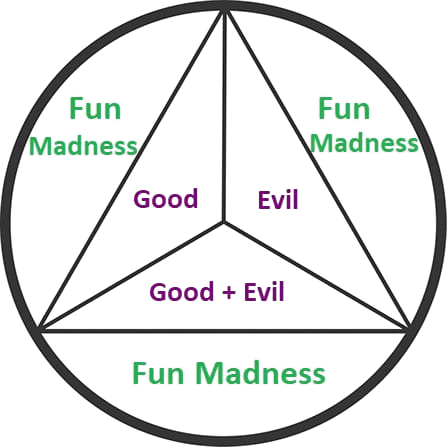 The Circle of Life: Inside the circle, Good and Evil stand apart, yet together they form balance. But beyond both lies Fun Madness — the greater force that surrounds and contains all. Good may shine, Evil may tempt, yet Fun Madness is the freedom that breaks their limits. In the end, all paths lead back to Fun Madness, the playful chaos at the heart of existence