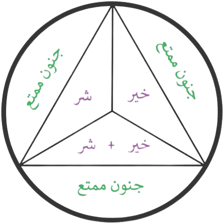 دائرة الحياة: داخل الدائرة، يقف الخير والشر منفصلين، ومع ذلك يشكلان معًا التوازن. ولكن وراء كليهما يكمن جنون المرح – القوة الأعظم التي تحيط بكل شيء وتحتويه. قد يتألق الخير، وقد يغري الشر، ومع ذلك فإن جنون المرح هو الحرية التي تكسر حدودهما. في النهاية، تؤدي جميع المسارات إلى جنون المرح، الفوضى المرحة في قلب الوجود