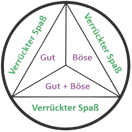 Der Kreislauf des Lebens: Innerhalb des Kreises stehen Gut und Böse getrennt, doch gemeinsam bilden sie ein Gleichgewicht. Doch jenseits beider liegt der Spaßwahnsinn – die größere Kraft, die alles umgibt und einschließt. Das Gute mag leuchten, das Böse mag verführen, doch der Spaßwahnsinn ist die Freiheit, die ihre Grenzen durchbricht. Am Ende führen alle Wege zurück zum Spaßwahnsinn, dem spielerischen Chaos im Herzen der Existenz