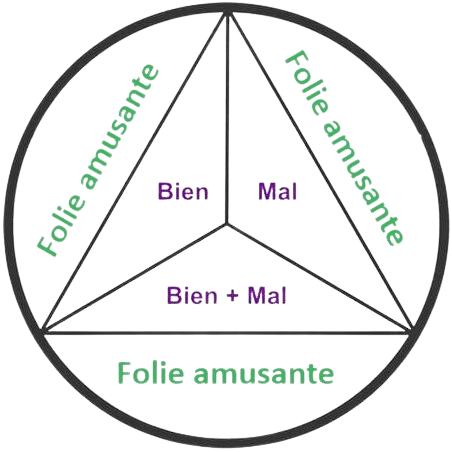 Le Cercle de la Vie : À l’intérieur du cercle, le Bien et le Mal se tiennent à l’écart, mais ensemble ils forment l’équilibre. Mais au-delà des deux se trouve la Folie du Plaisir — la force supérieure qui entoure et contient tout. Le Bien peut briller, le Mal peut tenter, mais la Folie du Plaisir est la liberté qui brise leurs limites. En fin de compte, tous les chemins mènent à la Folie du Plaisir, le chaos ludique au cœur de l’existence