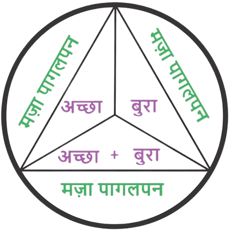 जीवन चक्र: इस चक्र के अंदर, अच्छाई और बुराई अलग-अलग हैं, फिर भी साथ मिलकर वे संतुलन बनाते हैं। लेकिन दोनों के परे है मस्ती का पागलपन – वह महान शक्ति जो सबको घेरे हुए है और अपने में समाहित करती है। अच्छाई चमक सकती है, बुराई लुभा सकती है, फिर भी मस्ती का पागलपन वह स्वतंत्रता है जो उनकी सीमाओं को तोड़ देती है। अंत में, सभी रास्ते मस्ती के पागलपन की ओर लौटते हैं, जो अस्तित्व के केंद्र में चंचल अराजकता है।