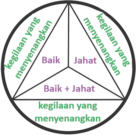 Lingkaran Kehidupan: Di dalam lingkaran, Kebaikan dan Kejahatan berdiri terpisah, namun bersama-sama mereka membentuk keseimbangan. Namun di balik keduanya terletak Kegilaan yang Menyenangkan — kekuatan yang lebih besar yang melingkupi dan melingkupi segalanya. Kebaikan mungkin bersinar, Kejahatan mungkin menggoda, namun Kegilaan yang Menyenangkan adalah kebebasan yang mendobrak batasan mereka. Pada akhirnya, semua jalan kembali ke Kegilaan yang Menyenangkan, kekacauan yang menyenangkan di jantung keberadaan
