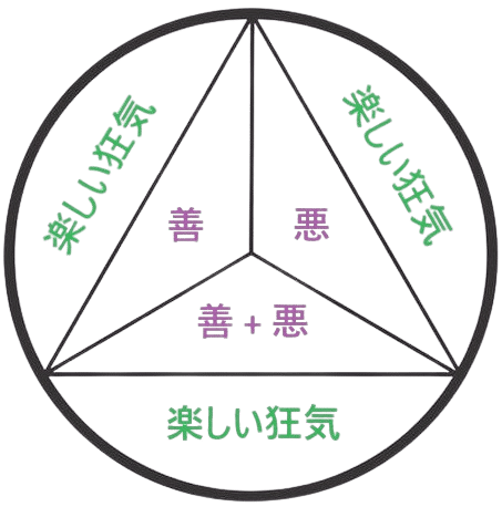 生命の輪:円の中では善と悪が別々に存在し、同時にバランスを形成しています。しかし、その両方を超えたところに、すべてを包み込み、包むより大きな力である「楽しさの狂気」が存在します。善は輝き、悪は誘惑しますが、「楽しさの狂気」はそれらの限界を打ち破る自由です。最終的に、すべての道は存在の中心にある遊び心のある混沌である「楽しさの狂気」へと戻っていきます